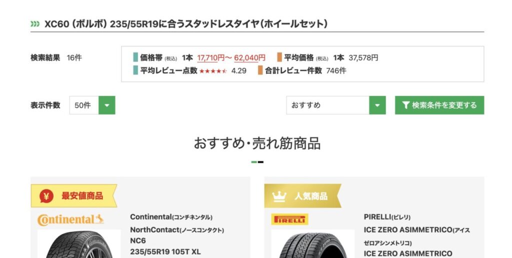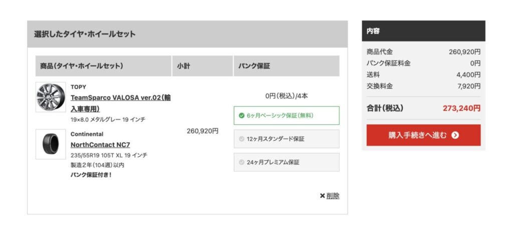 記事で紹介したおすすめ銘柄(ブリザック、ノキアン、ミシュランなど)が表示されます。 「パンク保証」や「工賃込みの総額」を確認して、カートに入れましょう。